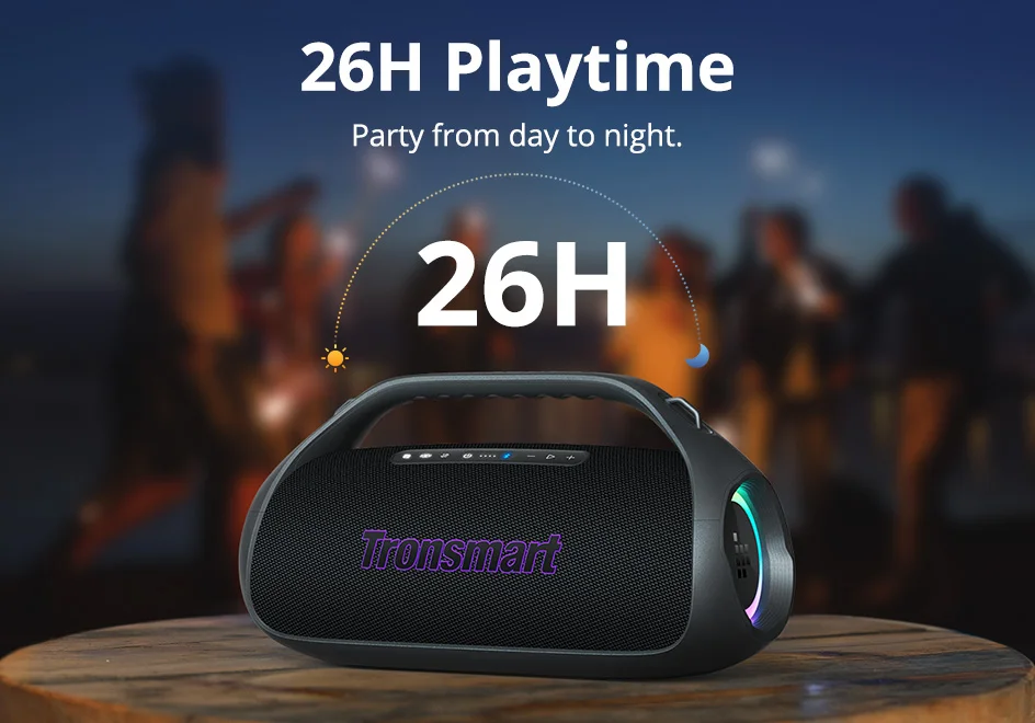 Playtime(Varied by LED Display, Volume Levels & Audio Contents): LED Off: Up to 26 Hours(50% Volume) LED On: Up to 7 Hours(50% Volume)