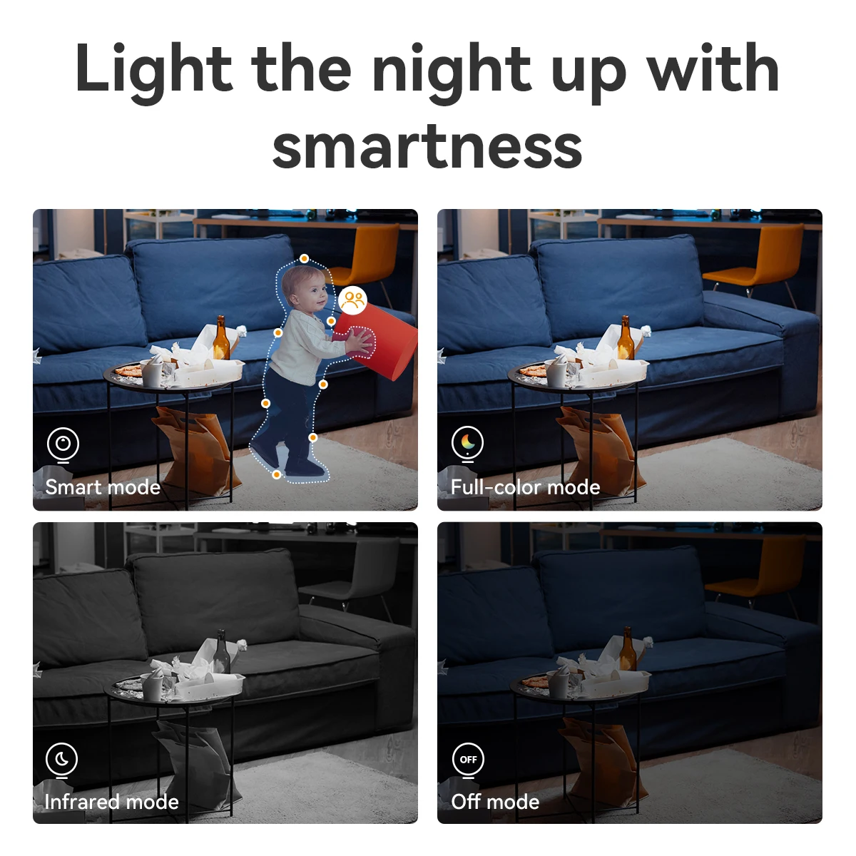 Com opções multimodo (Inteligente/Full-color/Infrarravermelho/Desligado), atende a diversas necessidades noturnas, combinando inteligência, clareza e flexibilidade do usuário para uma vigilância noturna ideal.