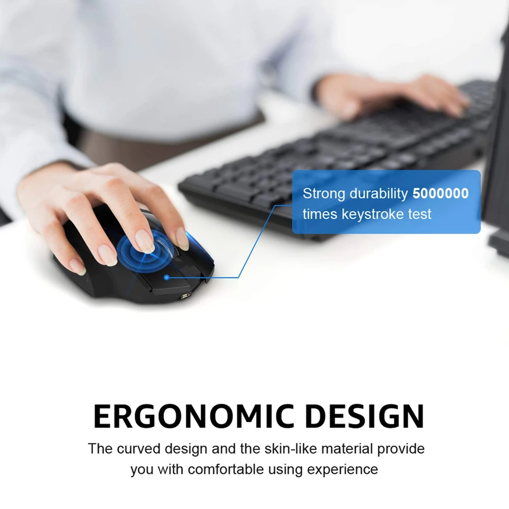 2) Clique silencioso.O design de clique silencioso para o botão esquerdo e direito se adapta às circunstâncias de uso do mouse em público, como biblioteca, dormitório, escritório e assim por diante, e além da indicação de luz azul durante a recarga e luz apagada após recarga completa, este design resulta sem preocupações para perturbar os outros.