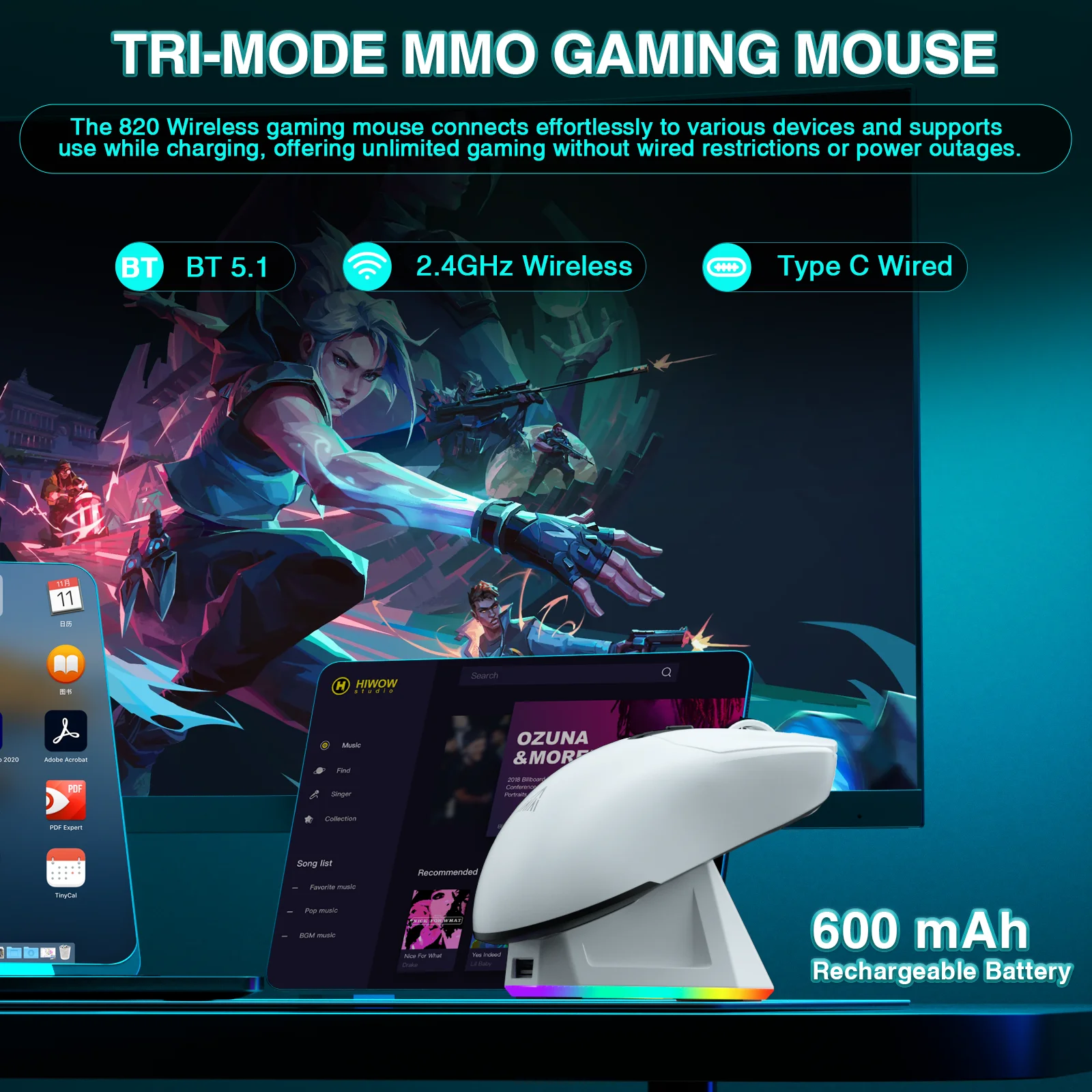 O Mouse Gamer SM820 tem vantagens significativas sobre os mouses comuns, com uma base de carregamento magnética RGB para carregamento fácil e efeitos de iluminação RGB coloridos que adicionam um toque decorativo único ao seu desktop.Além disso, a docking station também funciona como uma estação de acoplamento para otimizar o sinal sem fio de 2.4G, tornando-o mais estável e protegendo a sua experiência.