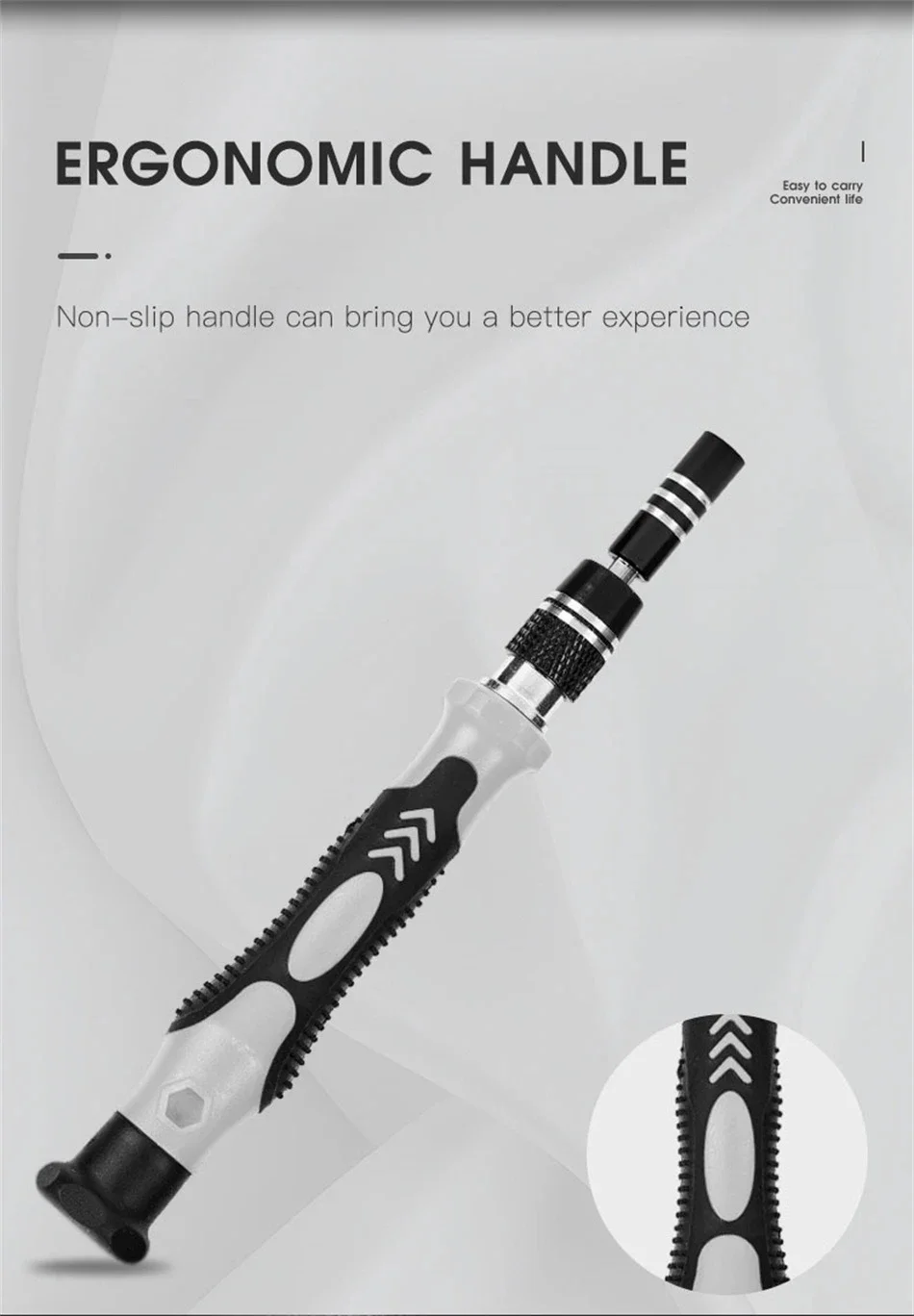 Seleção de broca super multifuncional, mais dura e durável. Este mini conjunto de chaves de fenda está equipado com brocas de precisão magnéticas de aço CRV, feitas de aço CR-V de alta qualidade com dureza de até 56HRC.Inclui conjuntos de chaves de fenda Torx, Phillips, Flat, Pentágono, Triangular e muitas outras chaves de fenda.Todas as brocas estão sujeitas a rigoroso controle de qualidade e alta precisão para garantir que todos os seus reparos sejam precisos e confiáveis.