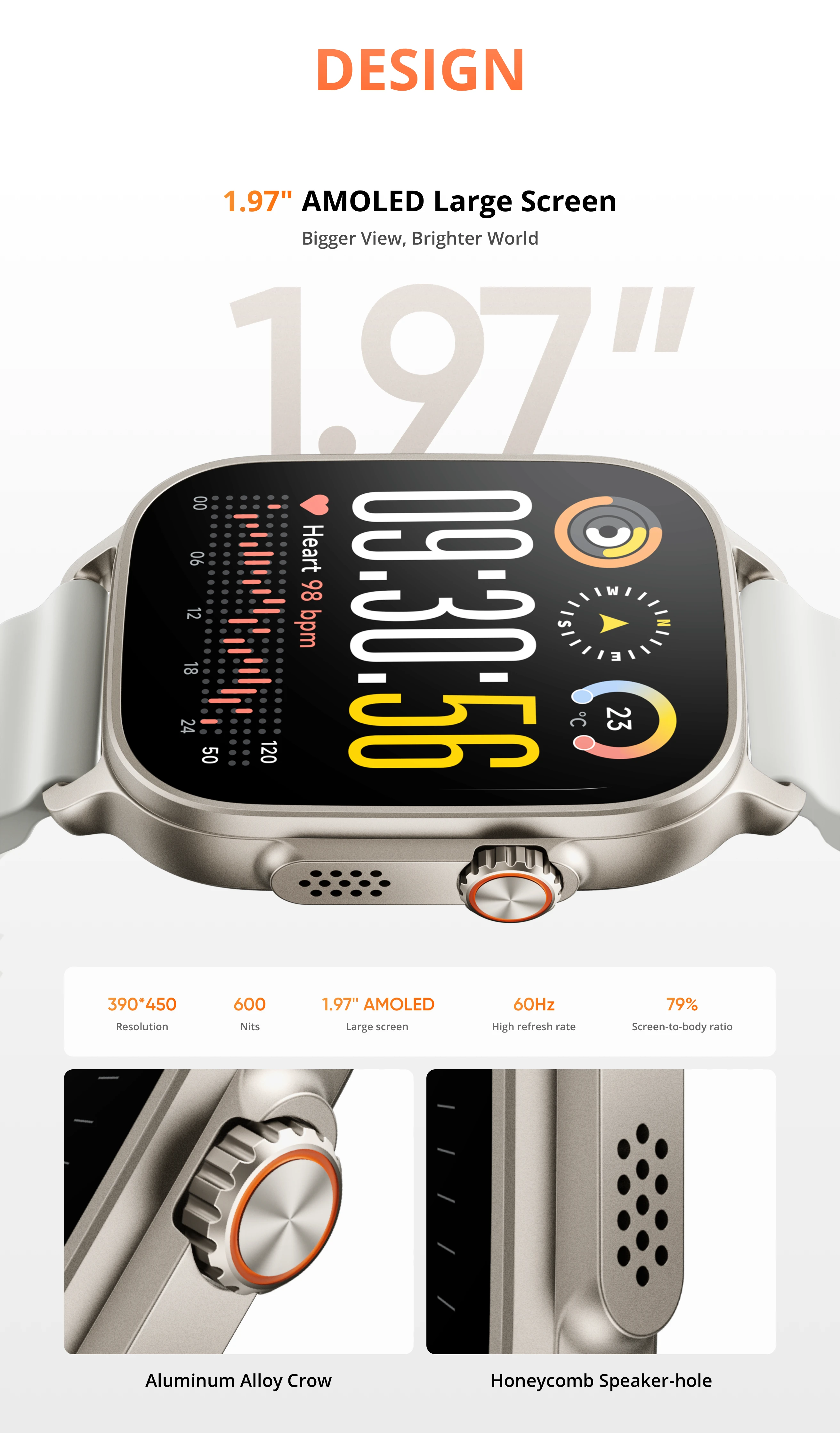Corpo:Tampa de vidro plana 2D extra grande, coroa funcional de liga de alumínio,Textura MetálicaUni-Body com furos para alto-falante em favo de mel